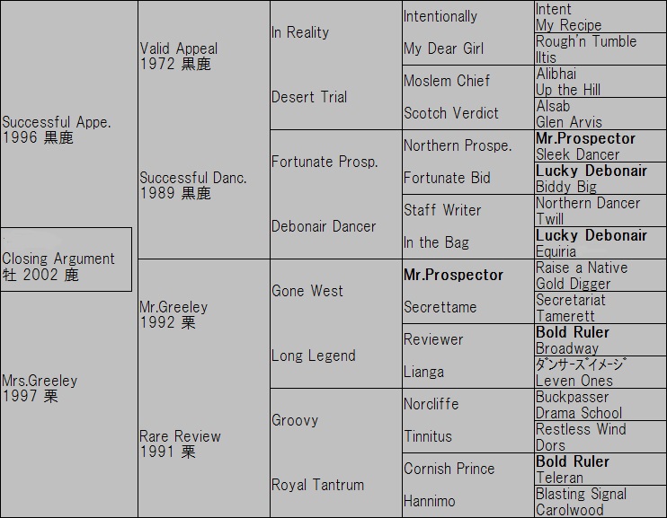 - 主な近親にナリタキングオー(スプリングステークス、京都新聞杯、共同通信杯4歳ステークス)、マイネルモルゲン(京成杯オータムハンデキャップ2回、ダービー卿チャレンジトロフィー)。